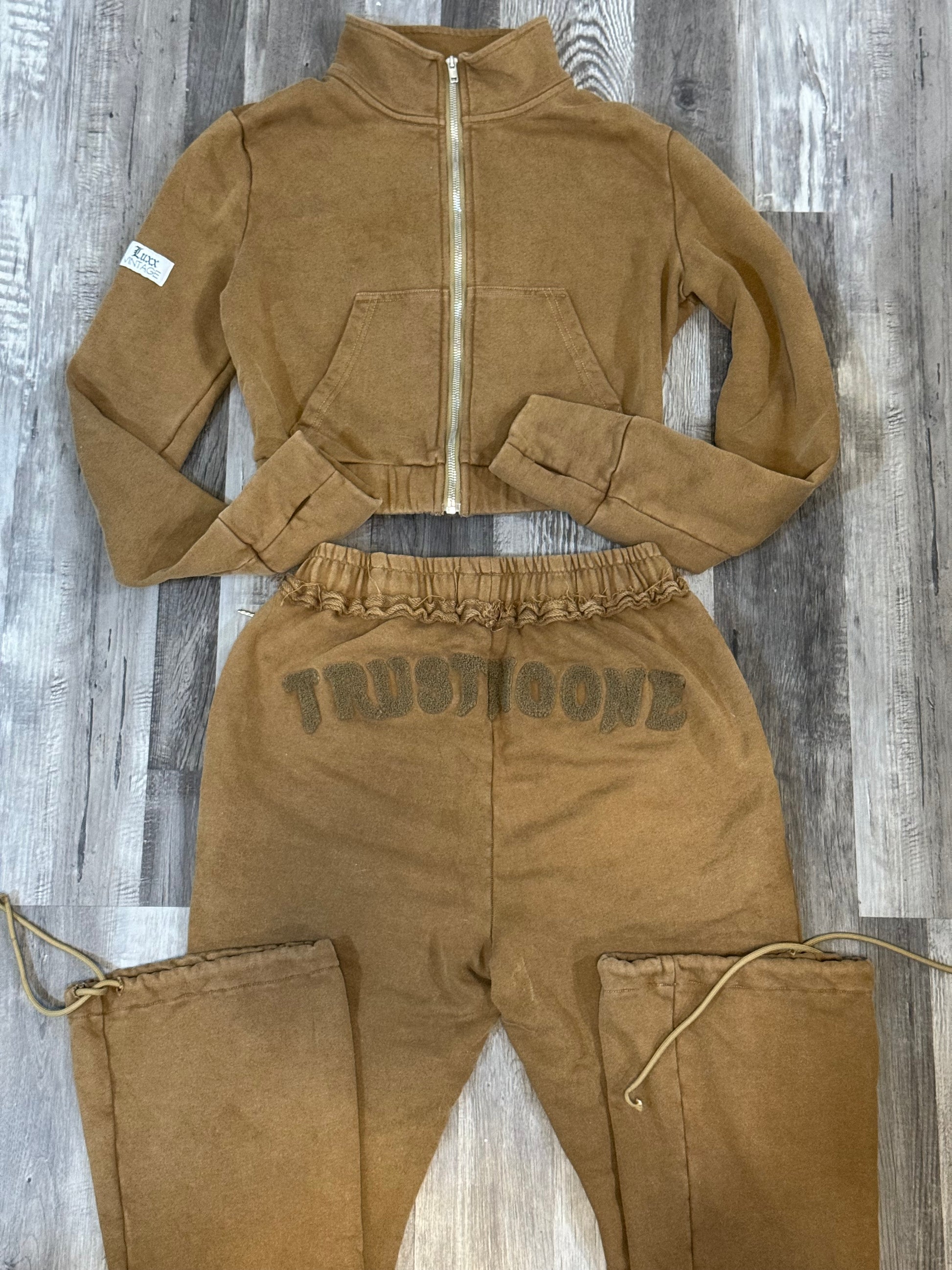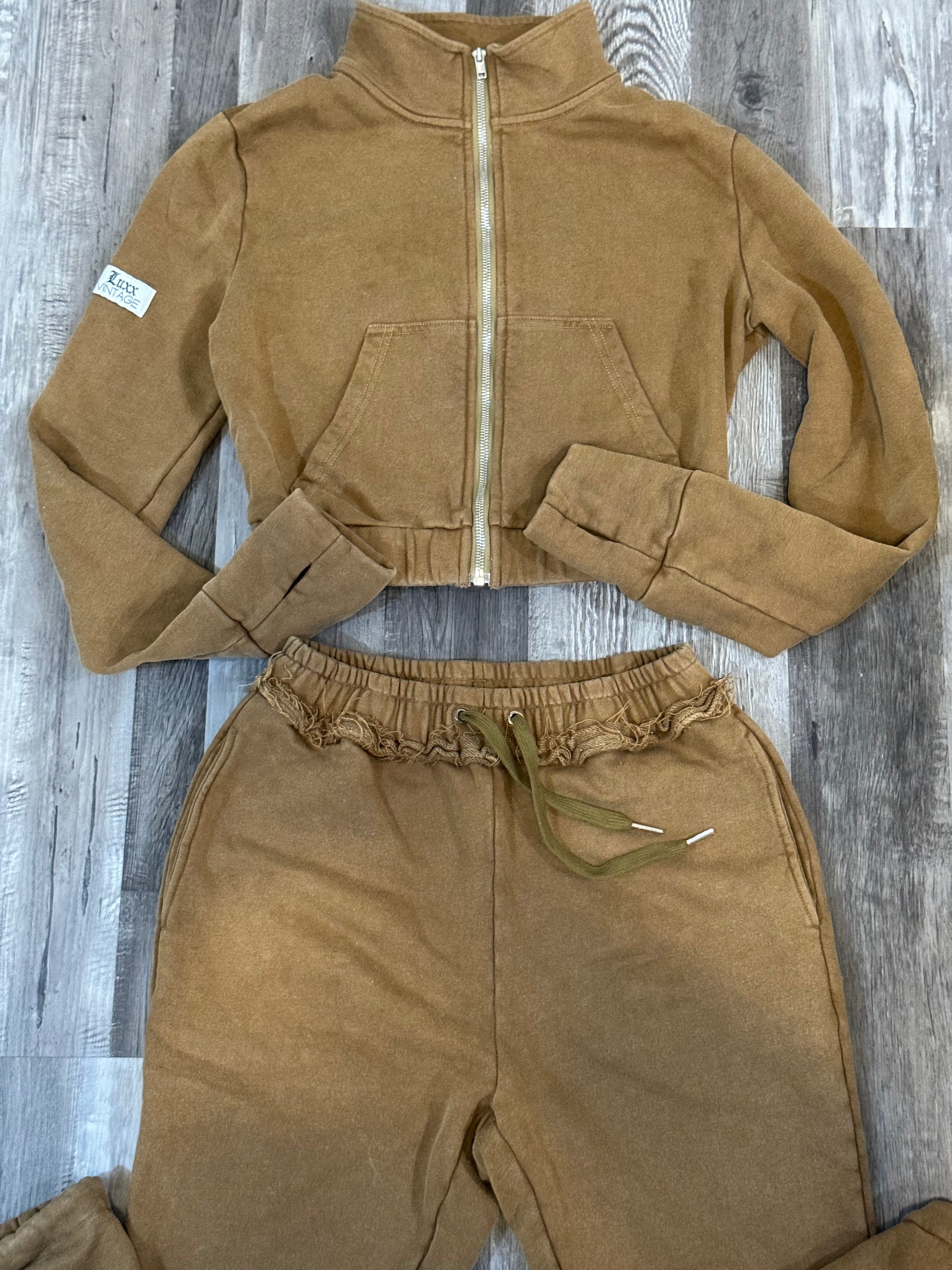 Original design by Luxx Vintage . Crafted with our high quality luxury material that has been customized to create this unique color. Our exclusive limited sweatsuit is a unique brown that has been hand washed to create this color. Each sweatsuit has some of our signature features that is on every customized piece. This is one of our original signature customized sets that can not be sold seperately.